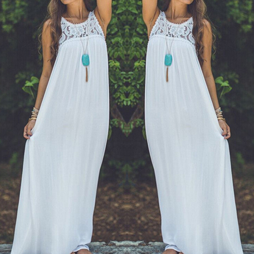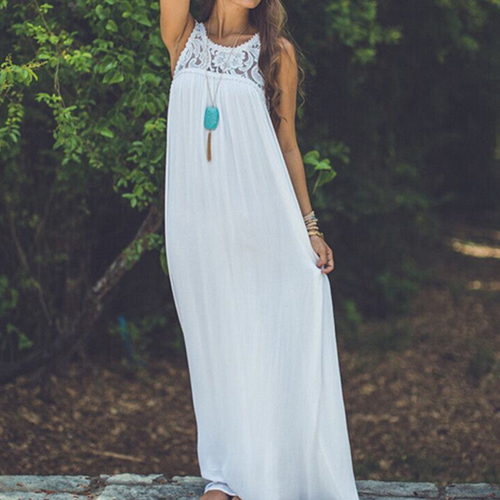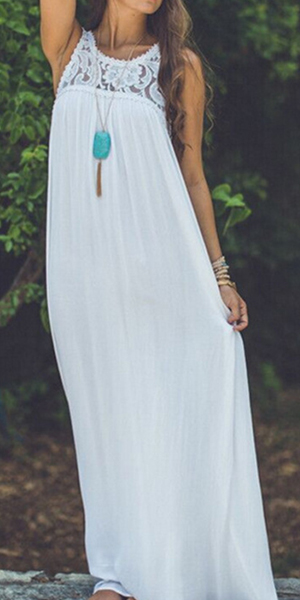 Hollow out lace spliced style,with sleeveless,round neck and a maxi length,this