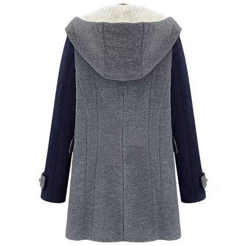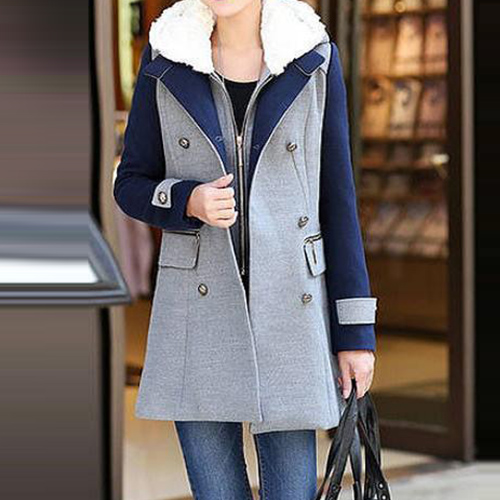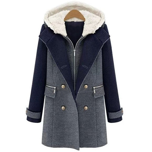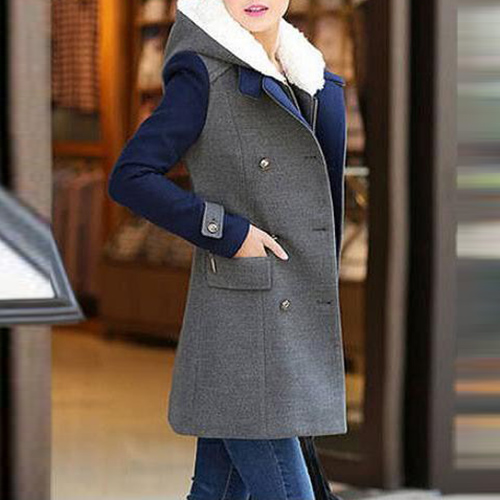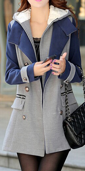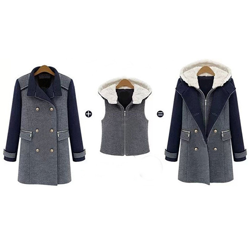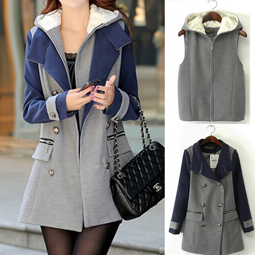 front zipper, hooded and sleeveless. Another piece is a woolen coat with contrast color, long sleeve, lapel