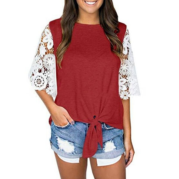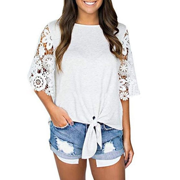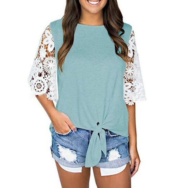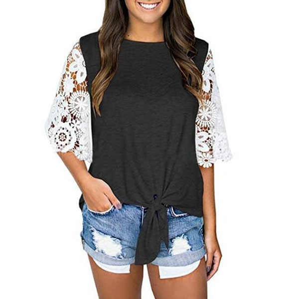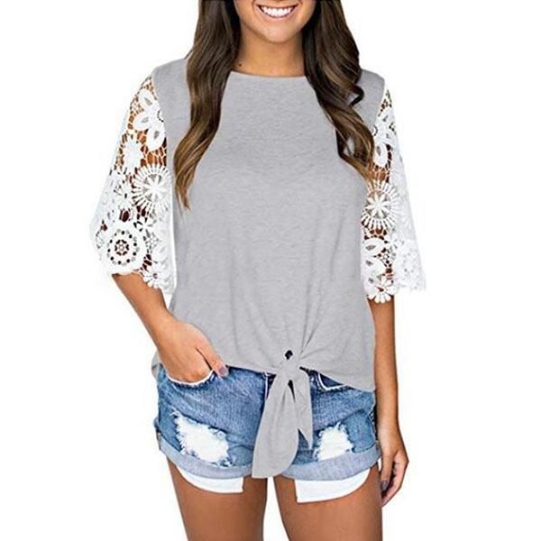 Looking for a different style t-shirt? Then how about this piece? Its lace spliced half sleeve and knotted