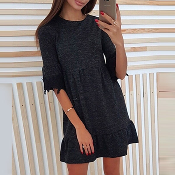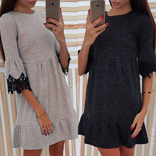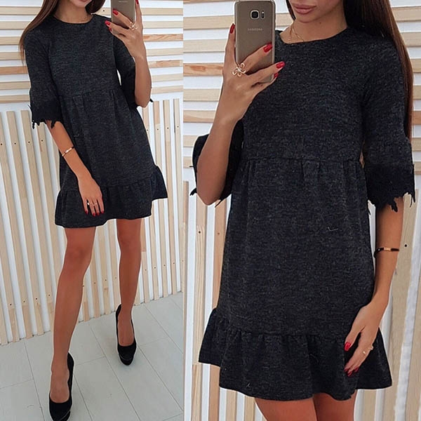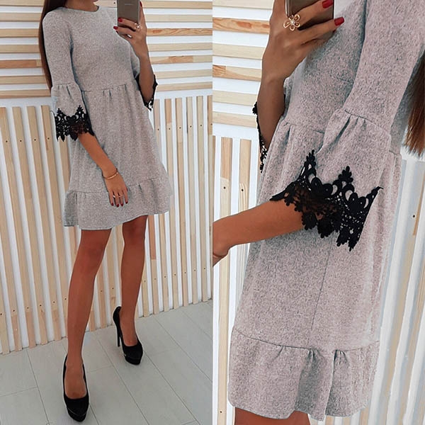 The lace spliced 3/4 sleeve and ruffle hem design will exude your sweet and feminine charm. Dress it up