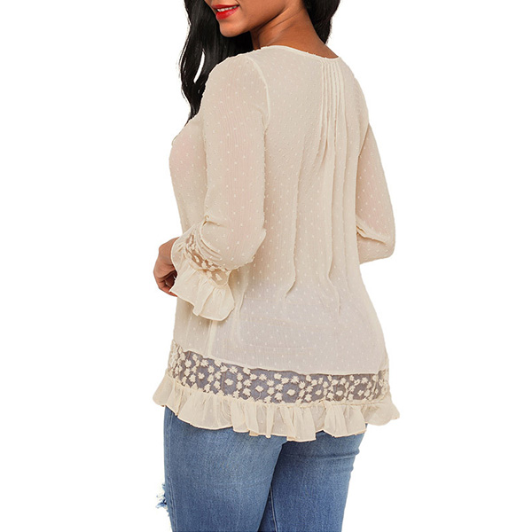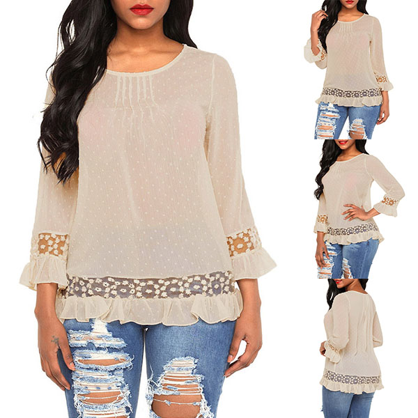 round neck,ruffle hem and lace spliced details,this wonderful piece can give you a comfortable day while