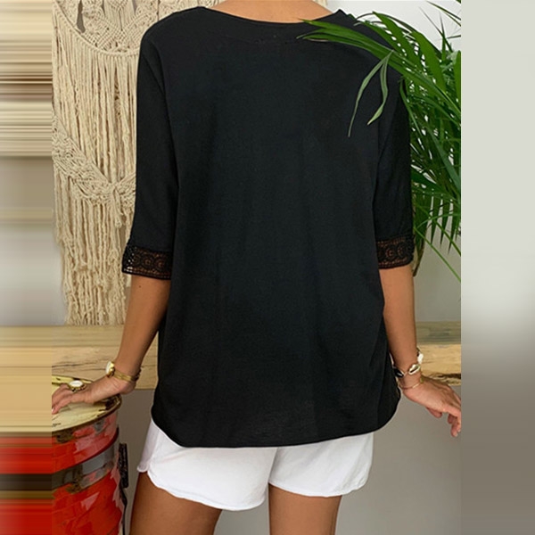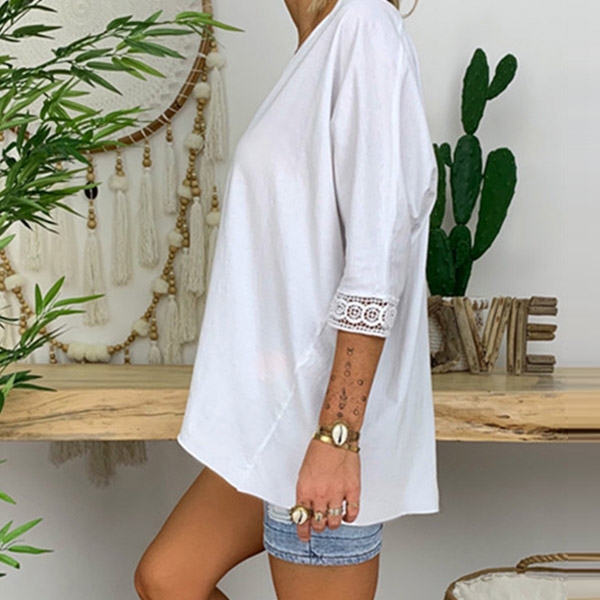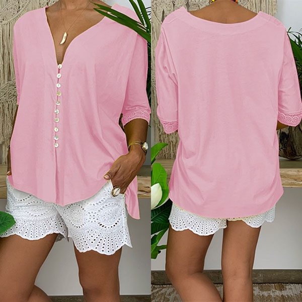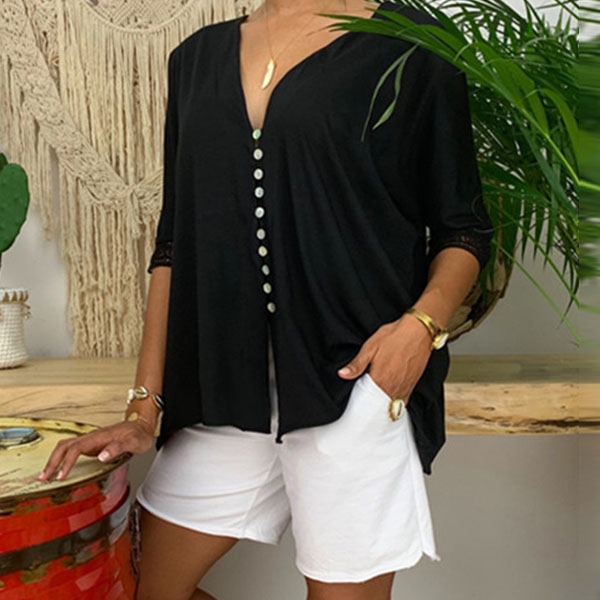 the lace spliced 3/4 sleeve,v-neck and front buttons design make this piece look sexy yet