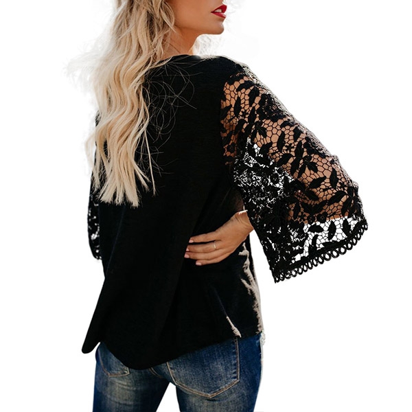 Comes with a classic yet flattering black tone,the lace spliced 3/4 trumpet sleeve design will make this