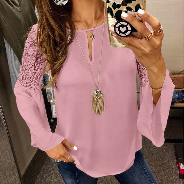 with exquisite trumpet sleeve,solid color ,round-neck and hollow out design.Embroidered pattern style which