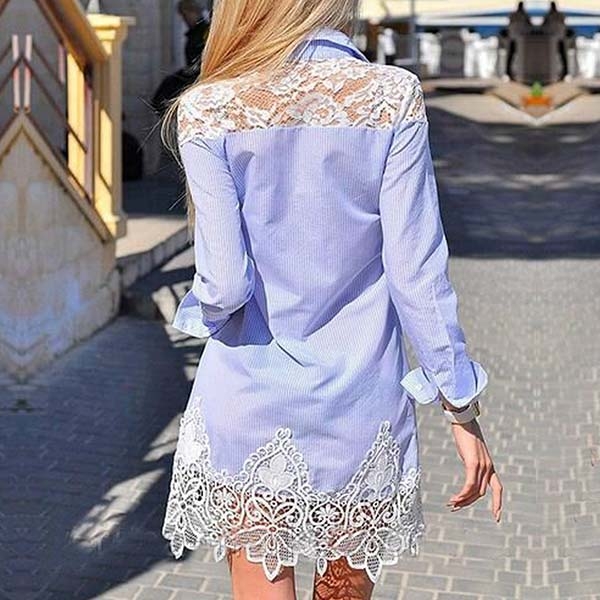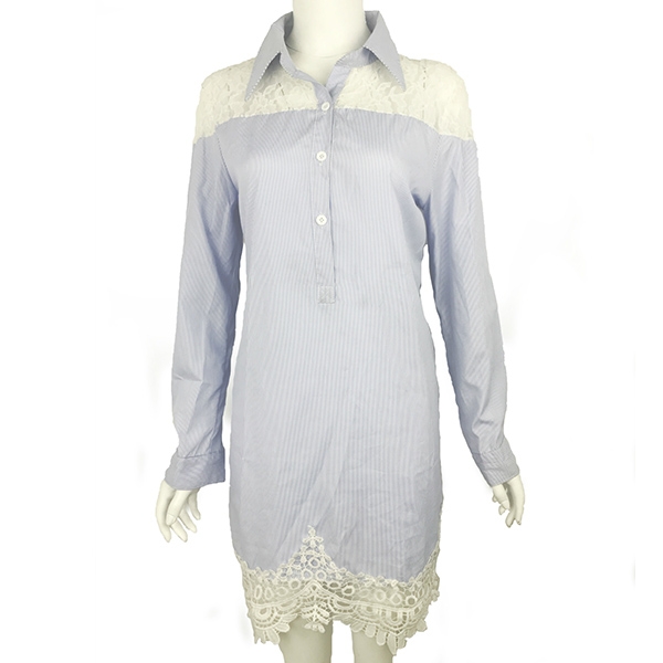 have this shirt dress in your team. Designed with striped element,the lace spliced details will enhance