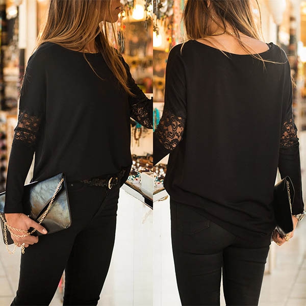 The flattering black tone and lace spliced design will enhance the charm of this t-shirt,while the soft