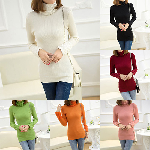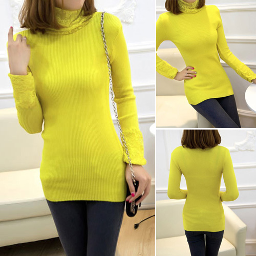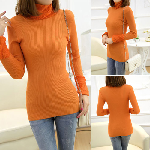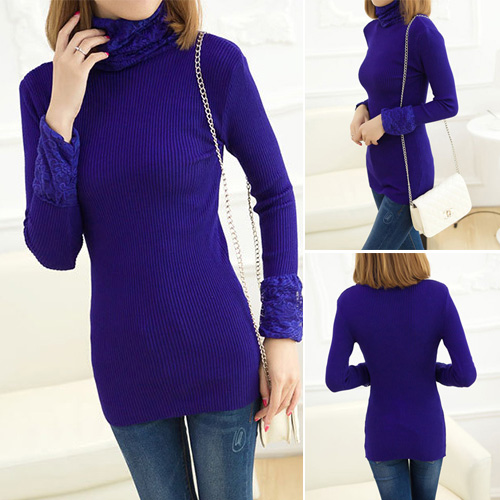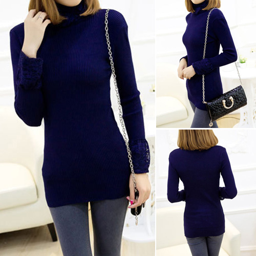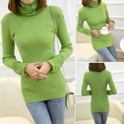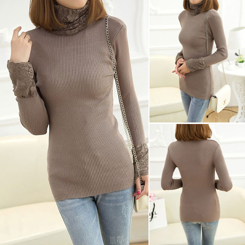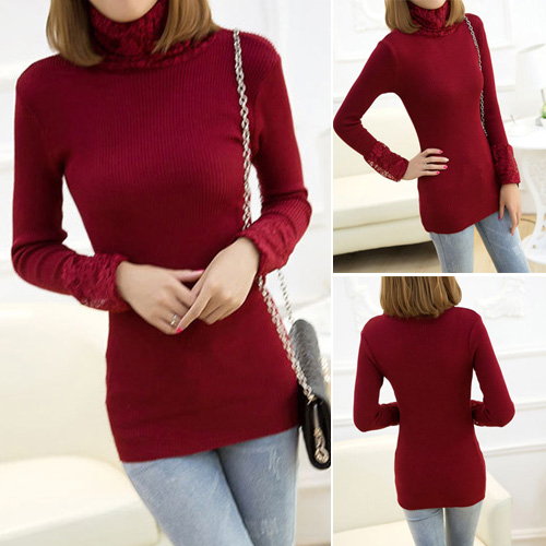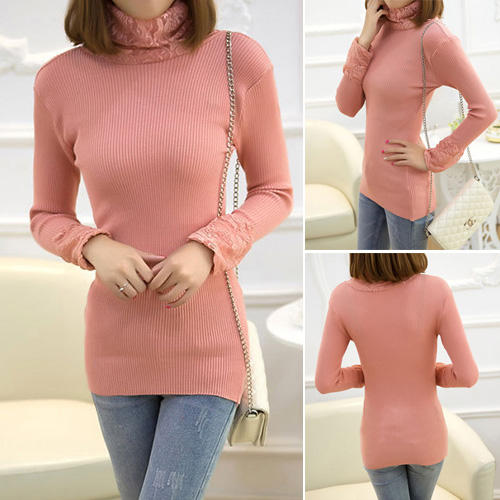Solid color style,with long sleeve and turtleneck design,cozy yet stylish. And its lace spliced design