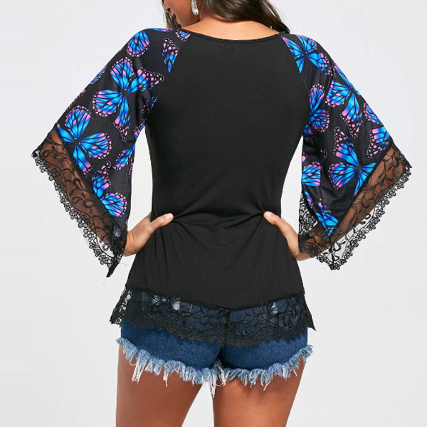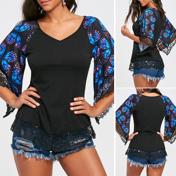 fabric can keep you comfy all day,while the v--neck and lace spliced printed trumpet sleeve design will