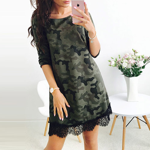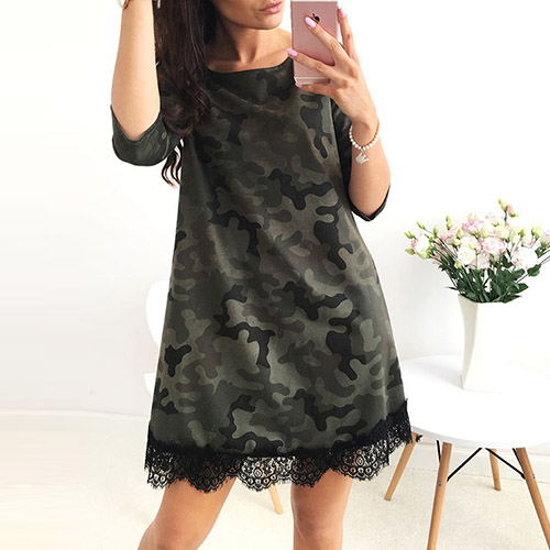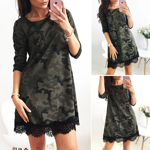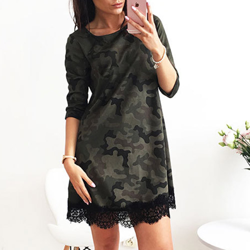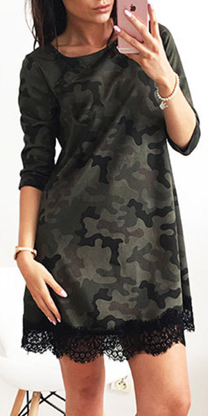 come out like this one. Camo style, this dress features round neck, 3/4 sleeve and lace spliced
