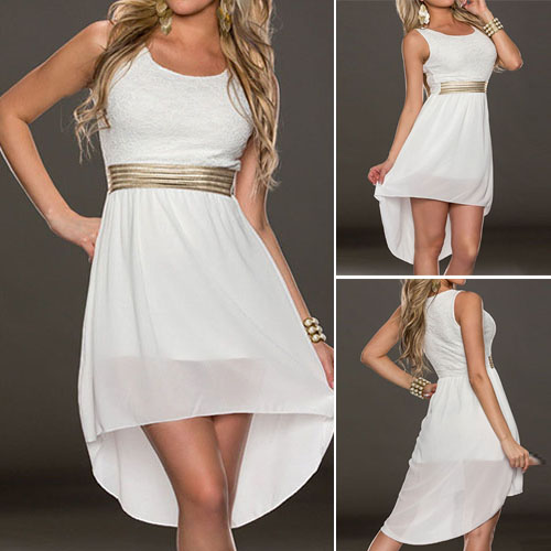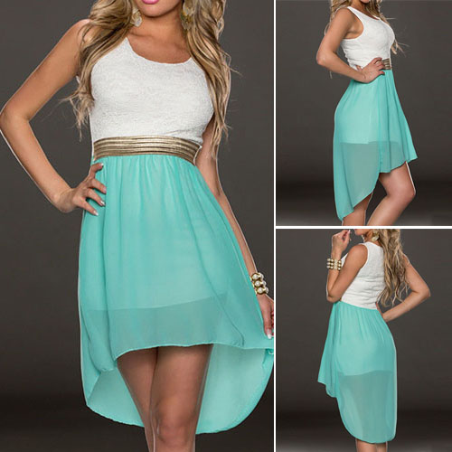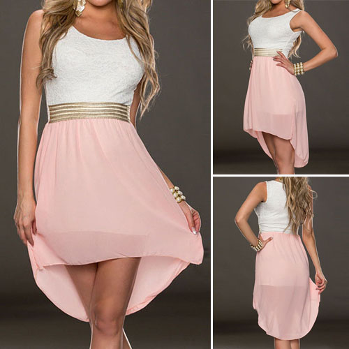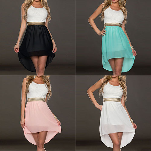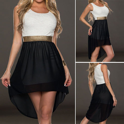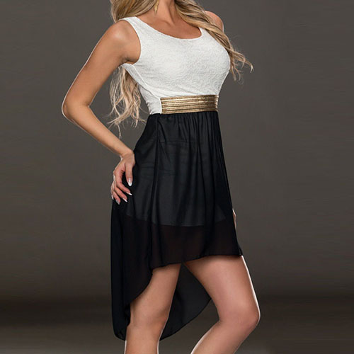 Lace spliced style,designed with sleeveless,round neck,high waist and a high-low hem,delicate