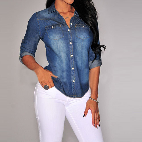 of style, this denim blouse can keep your youthful and vibrant look. With single-breasted, lapel and button-tab