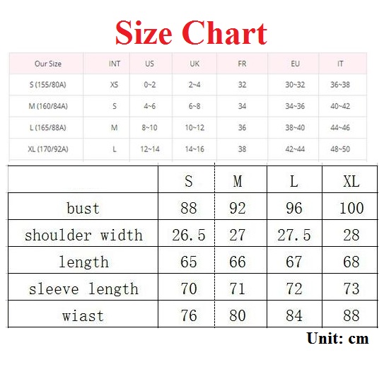 S : Bust : 88cm(34.65"); Waist : 76cm(29.92"); Shoulder : 26.5cm(10.43"); Sleeve : 70cm(27.56"); Length : 65cm(25.59");