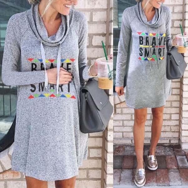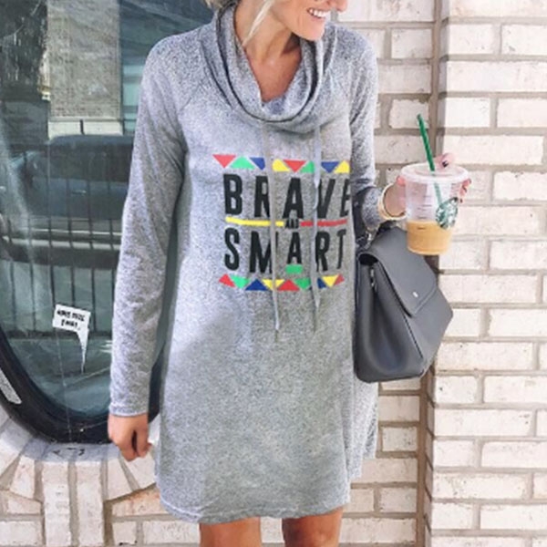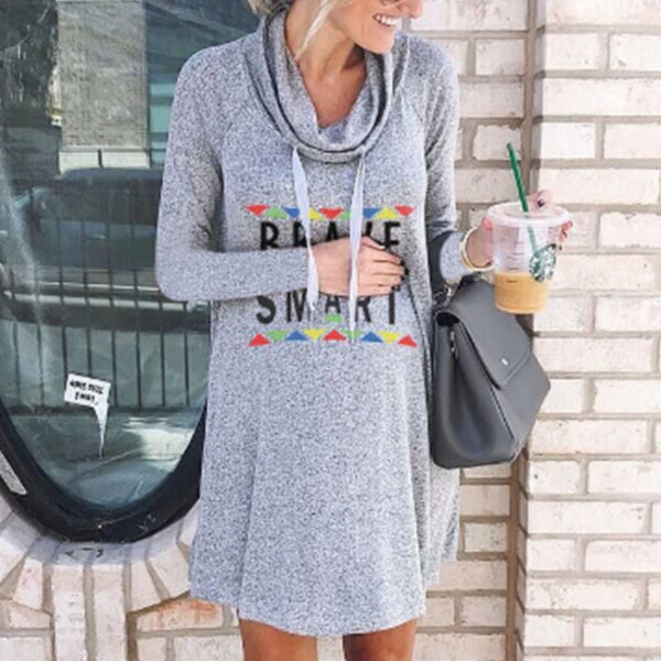 Fashion Letters Printed Long Sleeve Cowl Neck Loose Dress