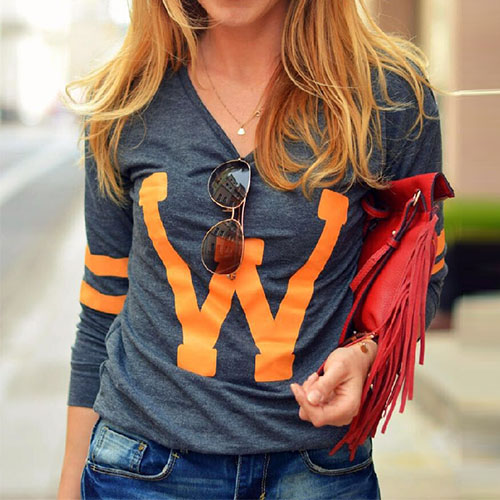 Letters printed style,with long sleeve,round neck and comfortable fabric,this t-shirt is a perfect blend