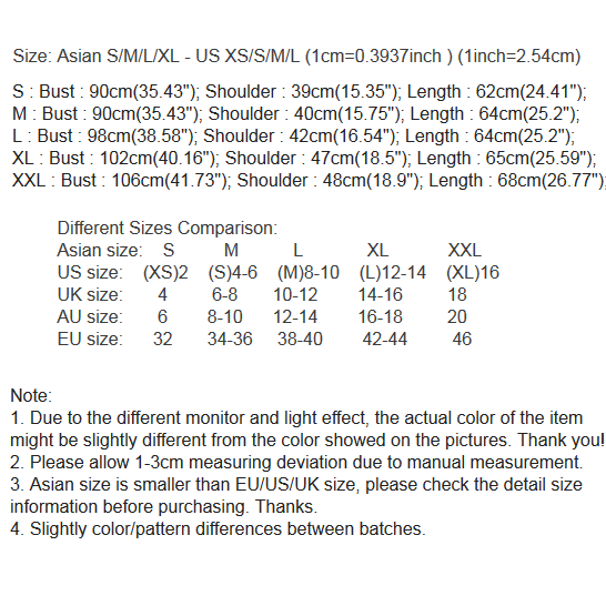 XL : Bust : 102cm(40.16"); Shoulder : 47cm(18.5"); Length : 65cm(25.59");