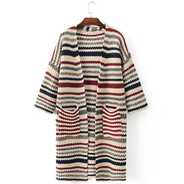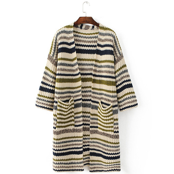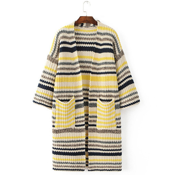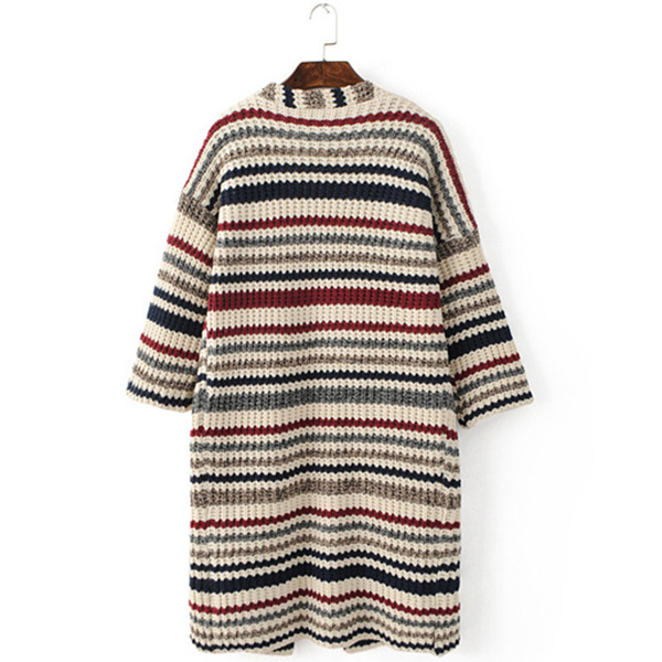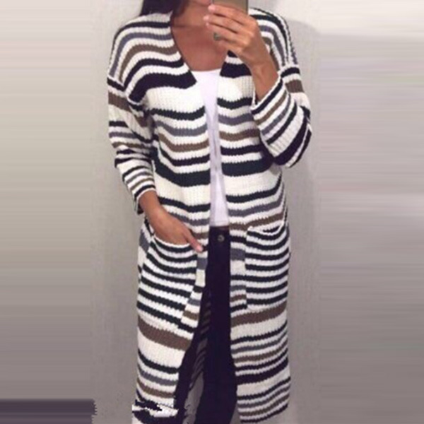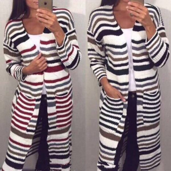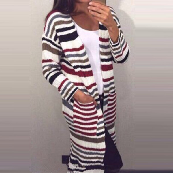 Looking for a shining and eye-catching look? Trust me,this sweater cardigan can do the best. Contrast color stripes
