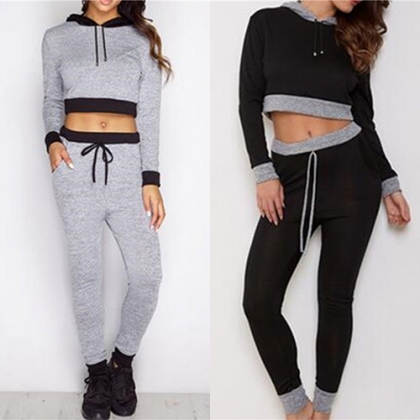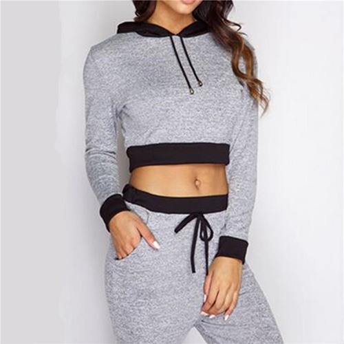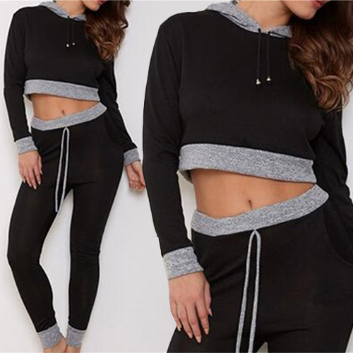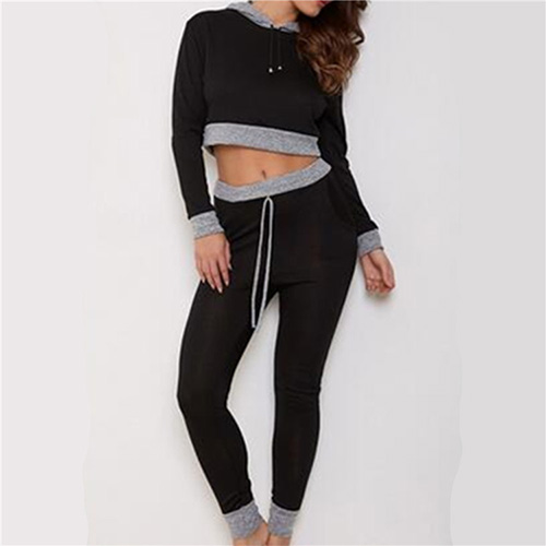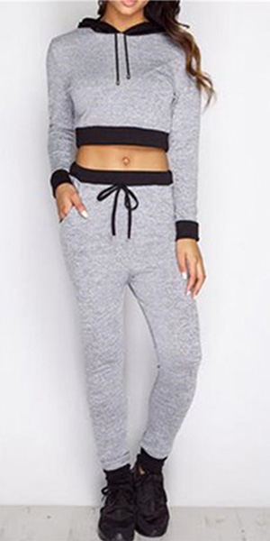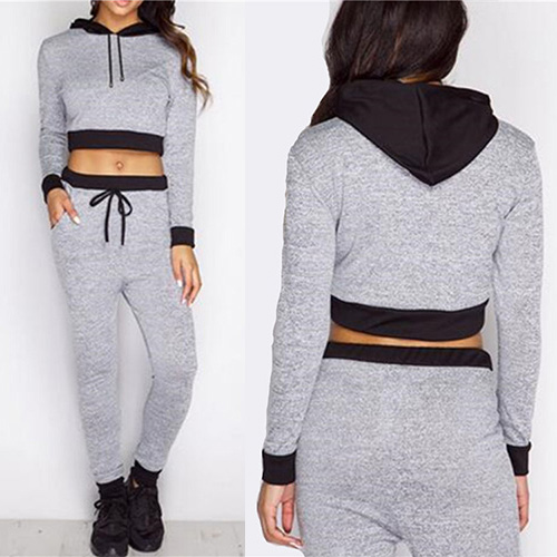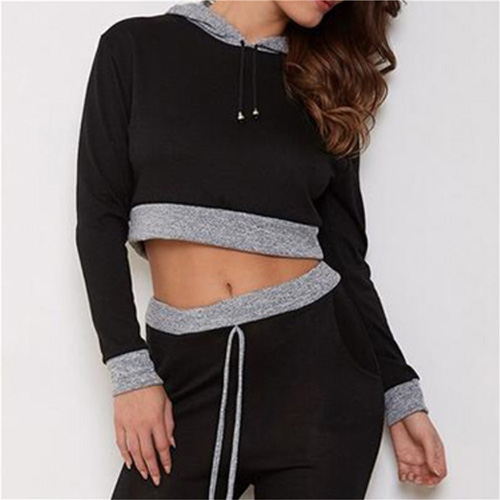 this two-piece set. Contrast color style,including a long sleeve hooded crop tops and a high waist