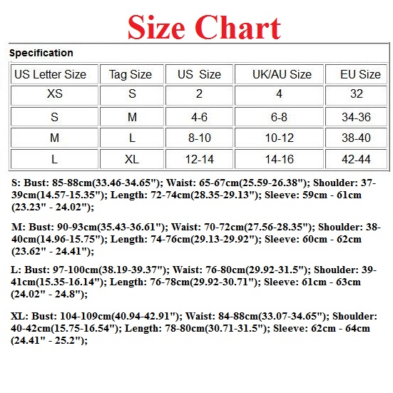 XL:Bust:104-109cm(40.94-42.91");Waist:84-88cm(33.07-34.65");Shoulder:40-42cm(15.75-16.54");