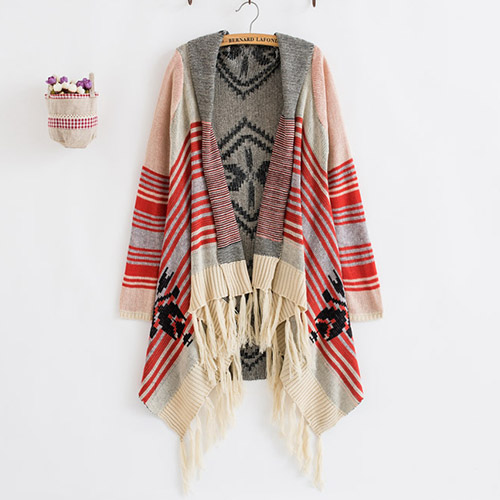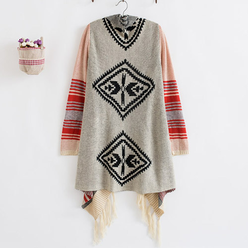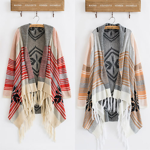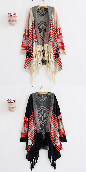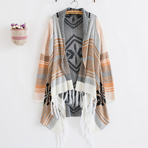 Contrast color striped style,with long sleeve,open-front and an irregular tassel hem design,