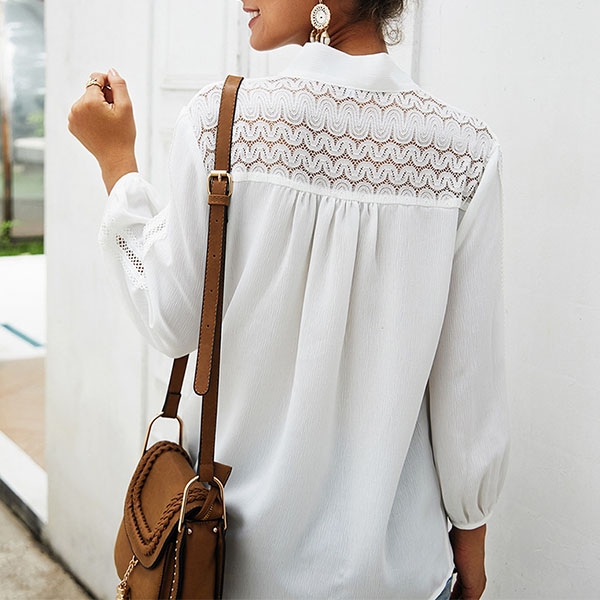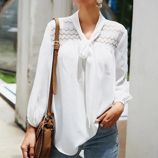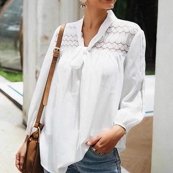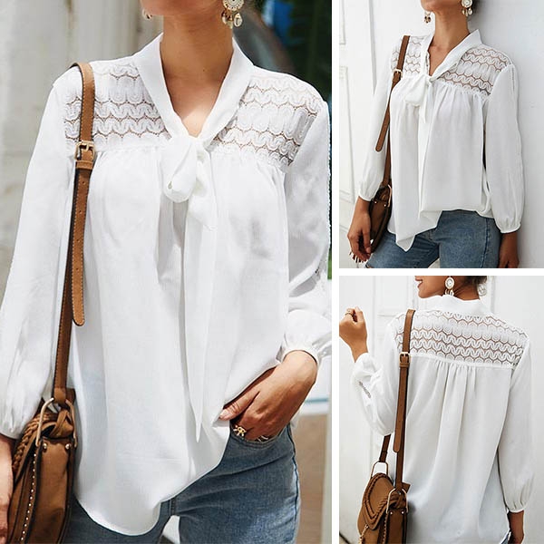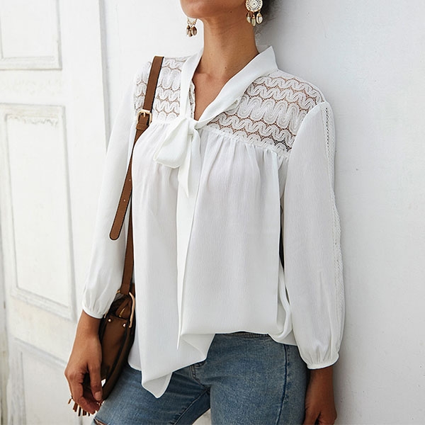 Only need one glance,you would be attracted by this stylish yet feminine blouse. Comes with a classic yet stylish white tone,the lace spliced and lace-up