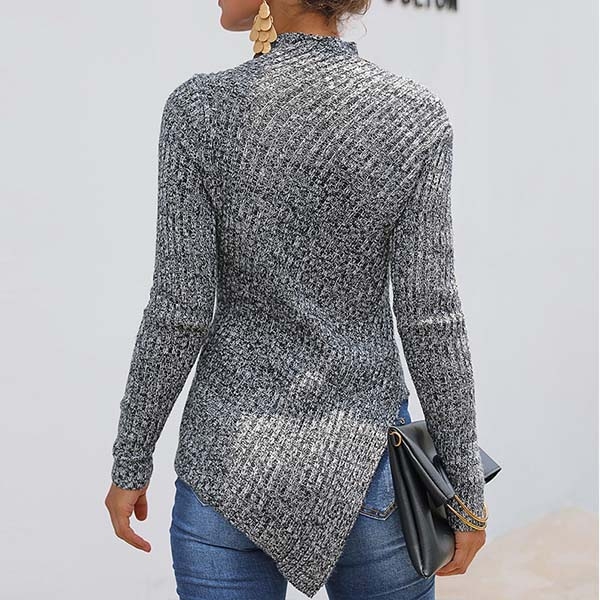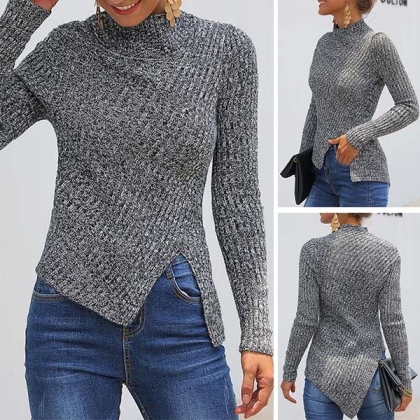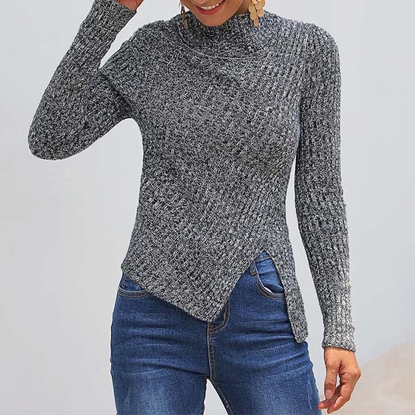 Finished with long sleeve,mock neck and irregular slit hem design,this sweater that bears a chic