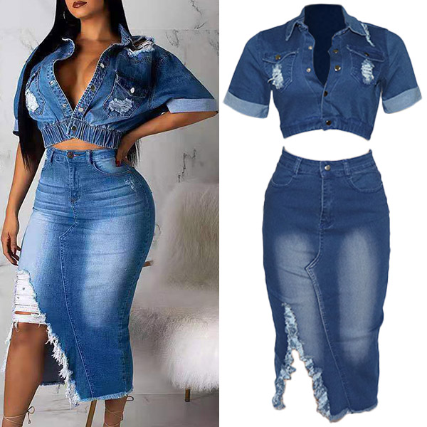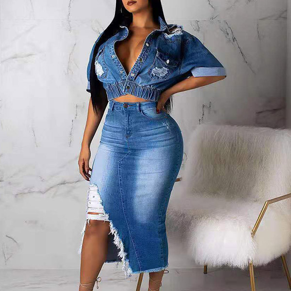 Fashion Long Sleeve POLO Collar Denim Shirt + High Waist Ripped Denim Skirt Two-piece Set