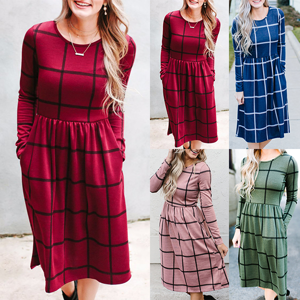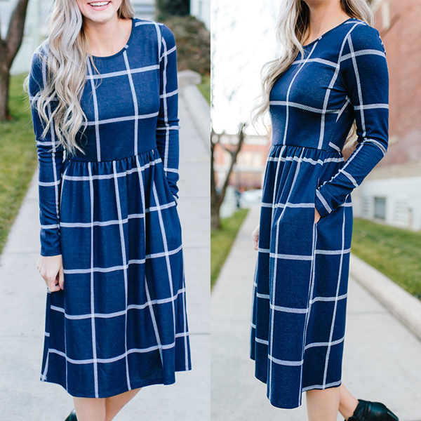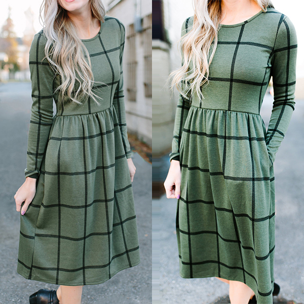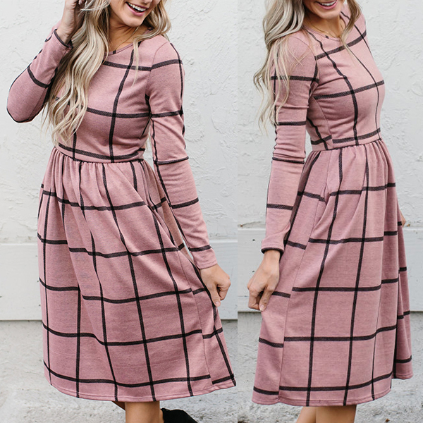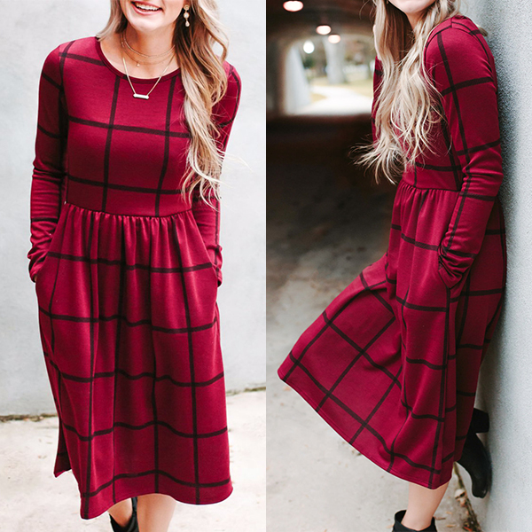 Plaid style,outfitted with long sleeve,round neck and high waist design,this dress is sure to give you a