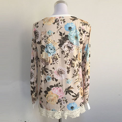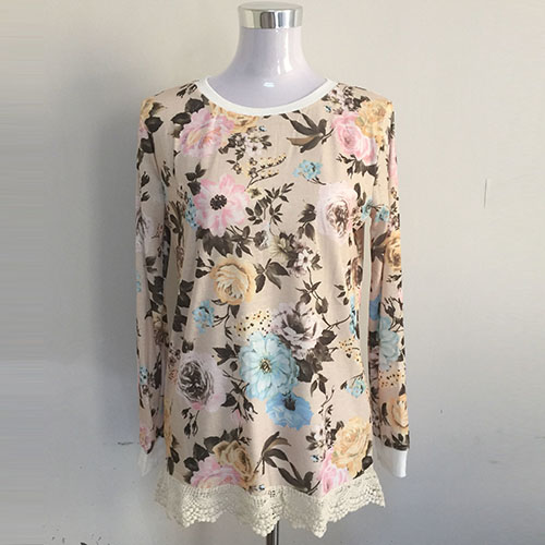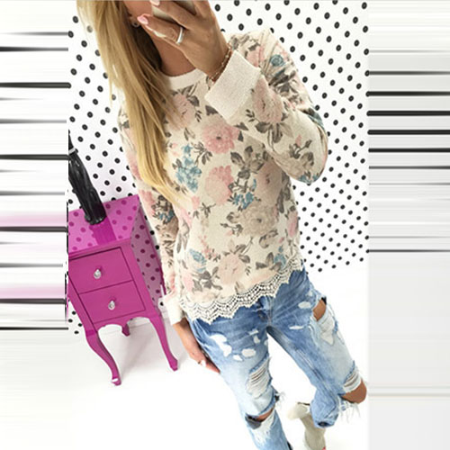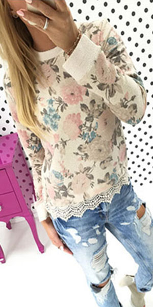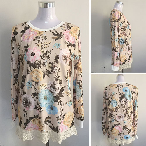This t-shirt features romantic and sweet floral print pattern,with long sleeve,round neck and lace