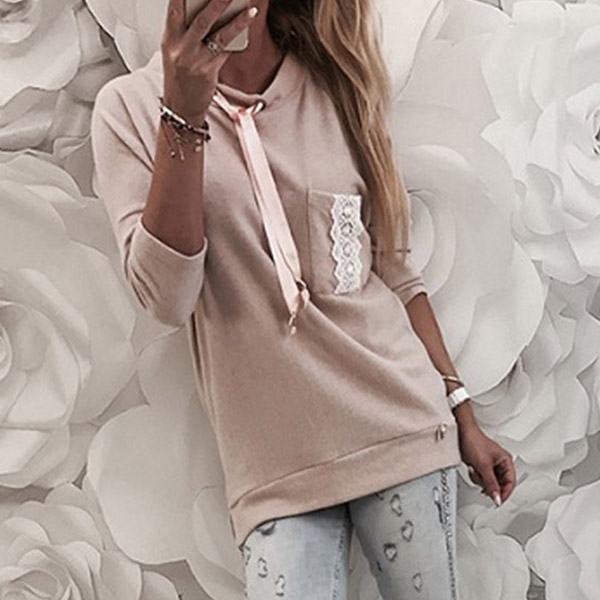 Boasting a sweet pink tone,the lace spliced design will enriches the design style. Collar part with drawstring