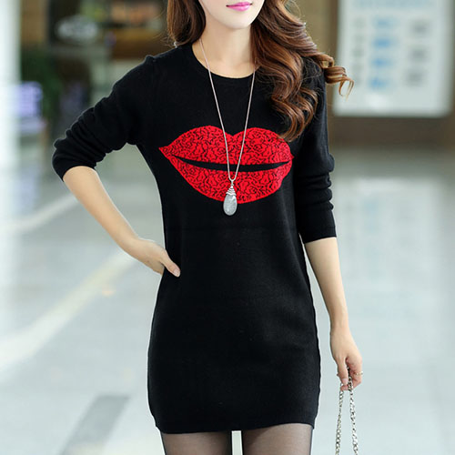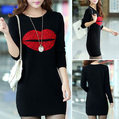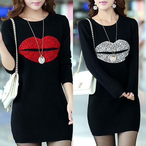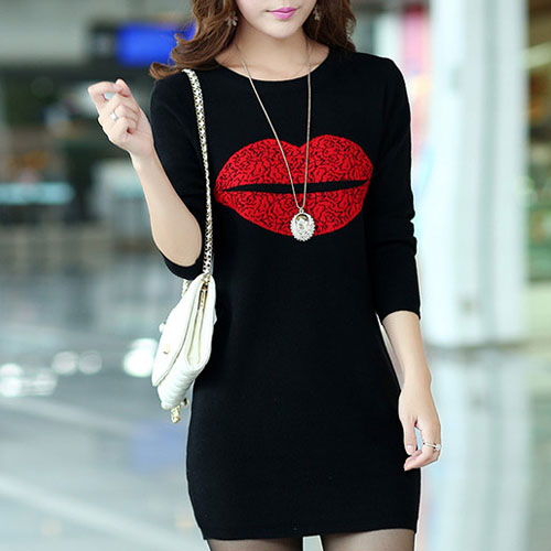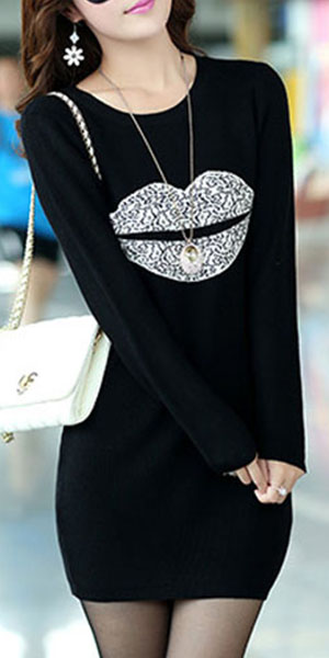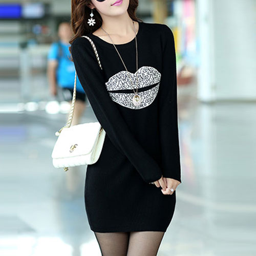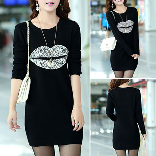 Fashion Long Sleeve Round Neck Lips Printed Slim Fit T-shirt Dress