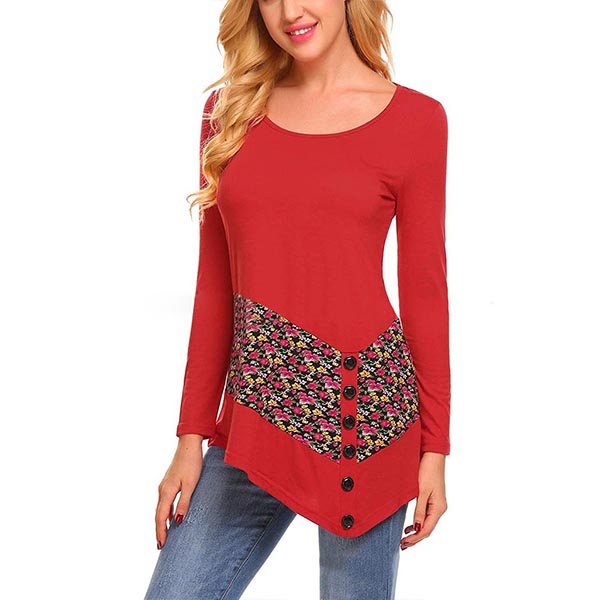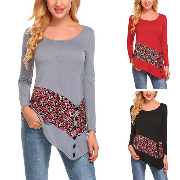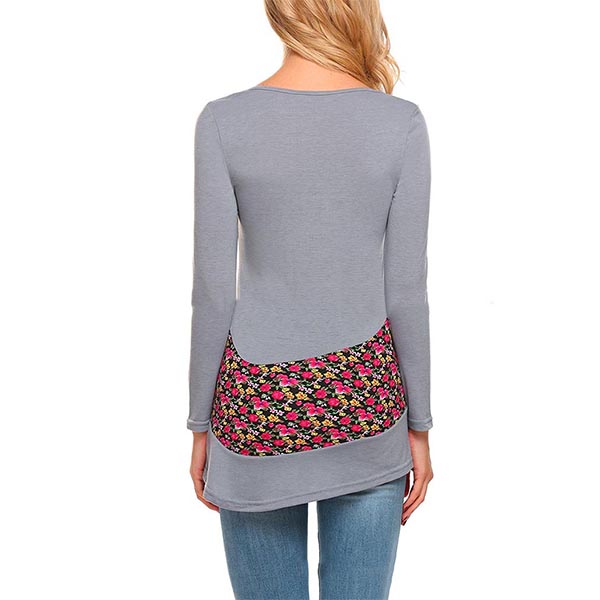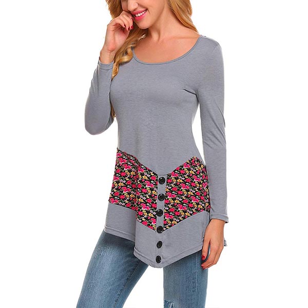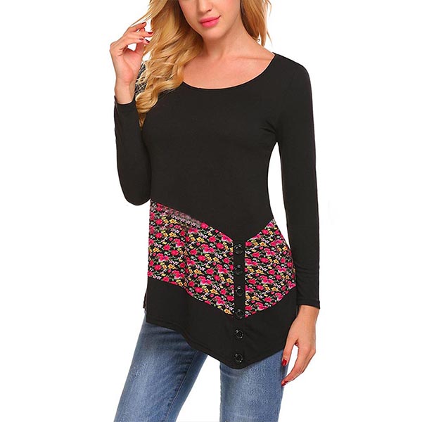 round neck and an irregular hem,simple yet chic. And the printed spliced design breaks the single design style.