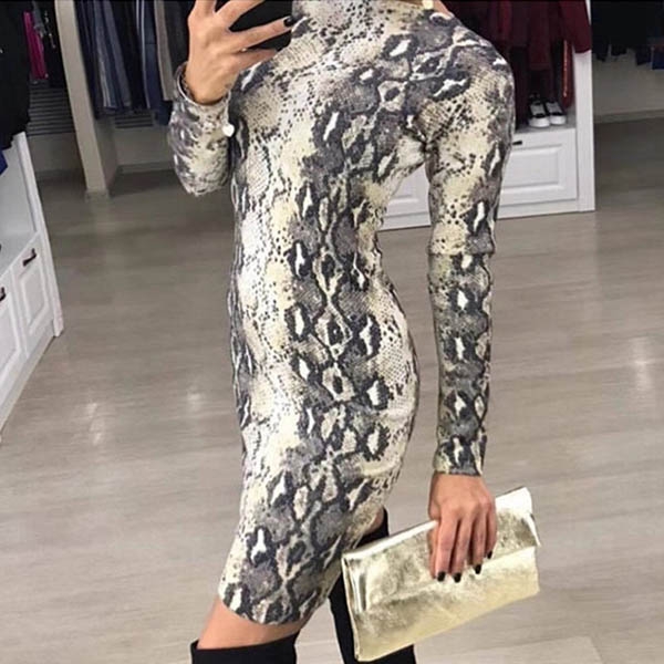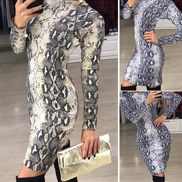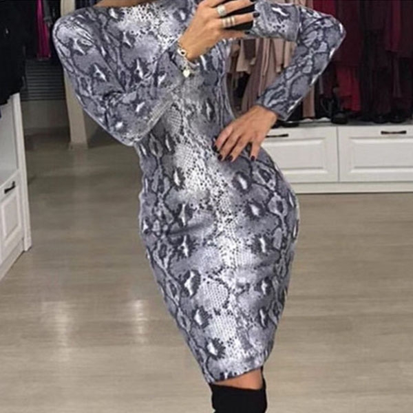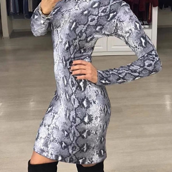 Fashion Long Sleeve Round Neck Slim Fit Serpentine Printed Dress
