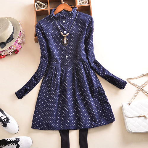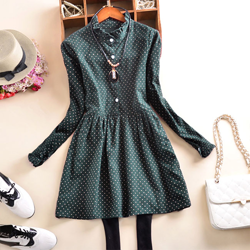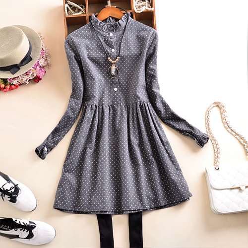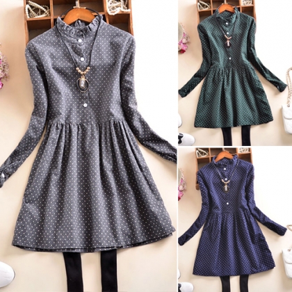 This dress features dots printed pattern,cute and chic. Styled with long sleeve,ruffle collar and cozy fabric,this
