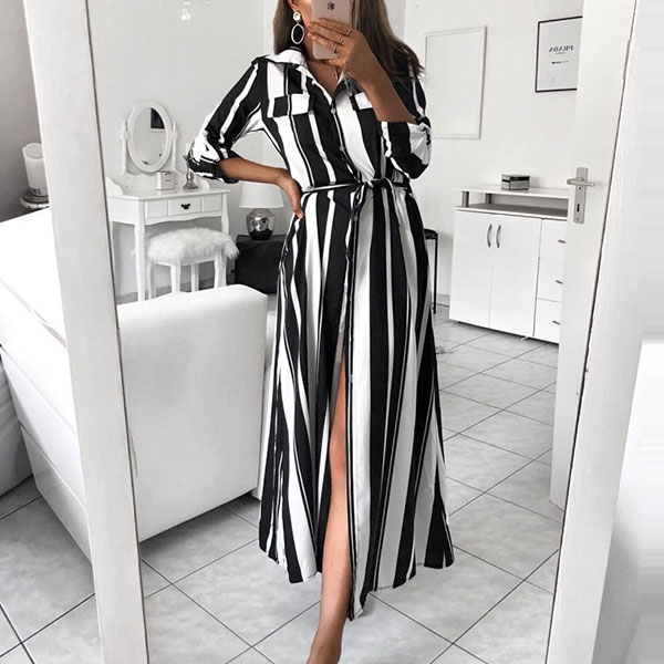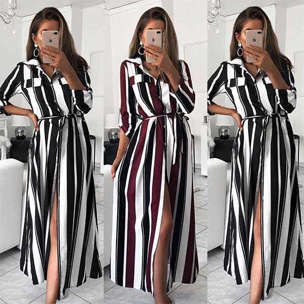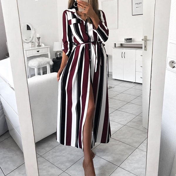 You can easily enhance your feminine appeal when you wear this shirt dress. Striped style,the slit hem design