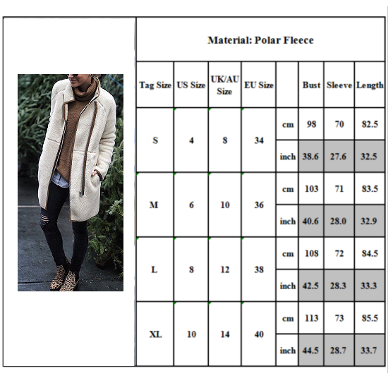 XL : Bust : 113cm(44.49"); Sleeve : 73cm(28.74"); Length : 85.5cm(33.66");