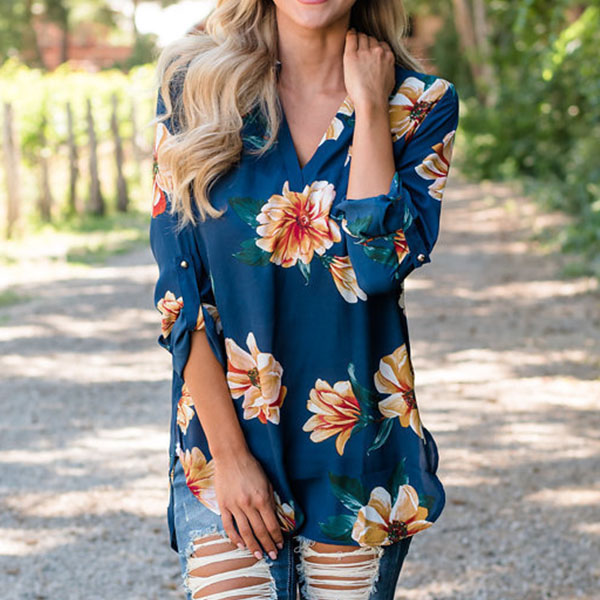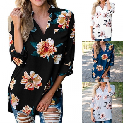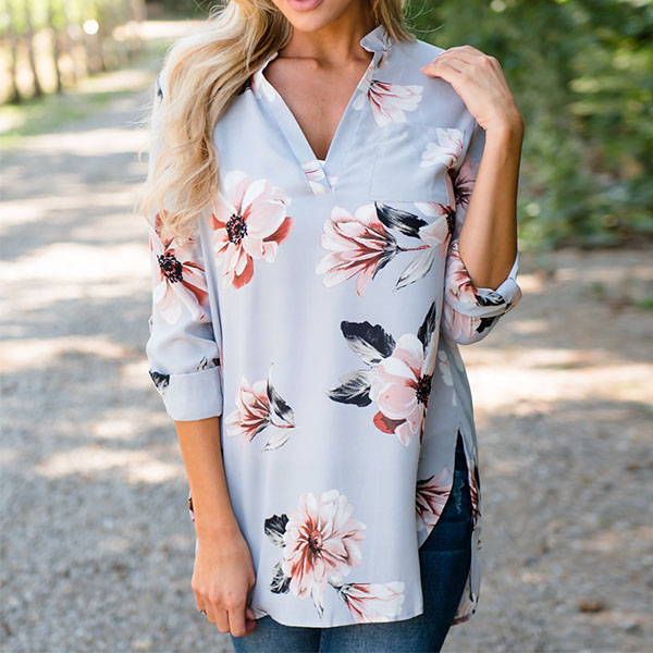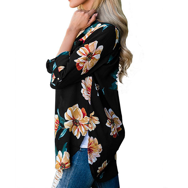 Boasts chic and sweet printed pattern,accompanied with long sleeve,v-neck,a high-low and a loose silhouette,