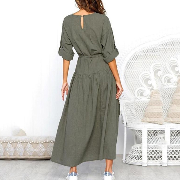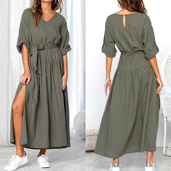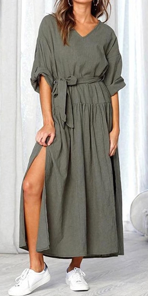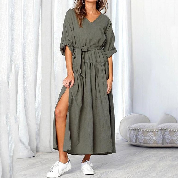 Fashion Long Sleeve V-neck Slit Hem Solid Color Maxi Dress