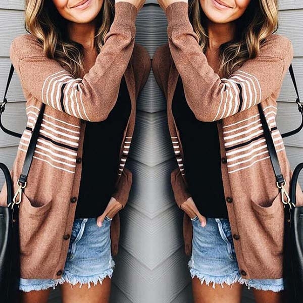 Give your wardrobe a seasonal update by adding this knit cardigan. The striped spliced design