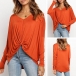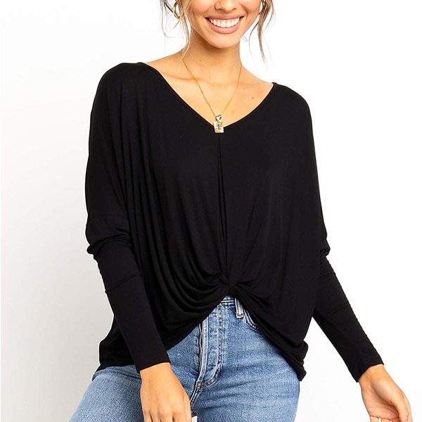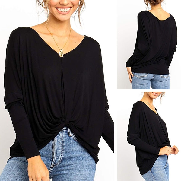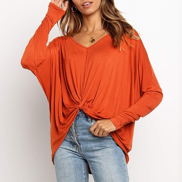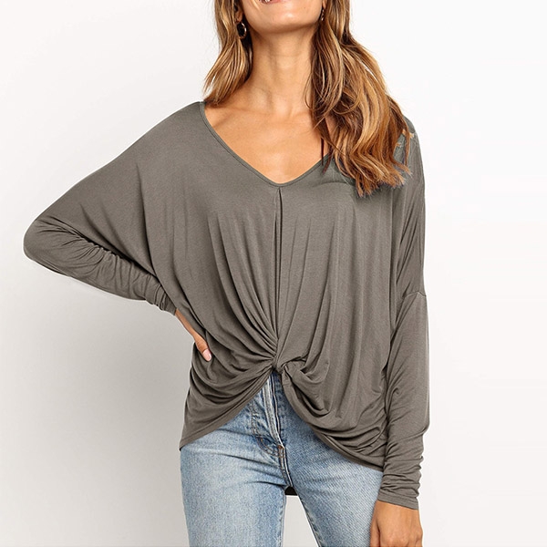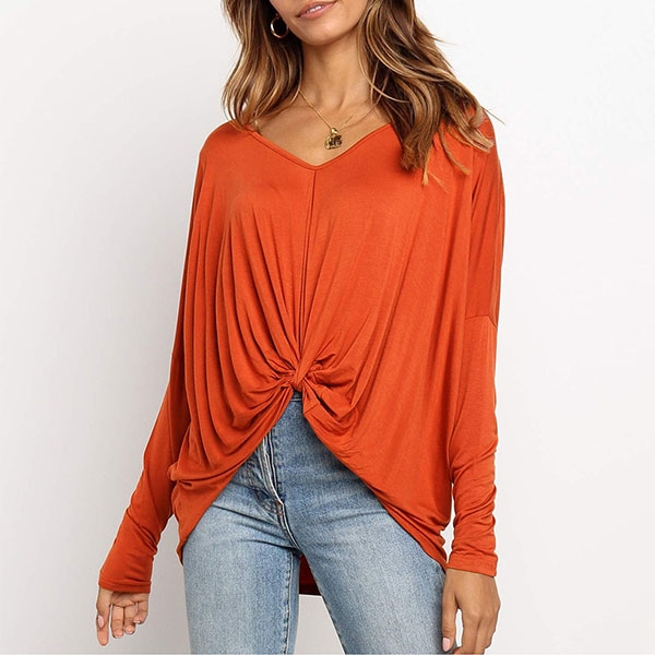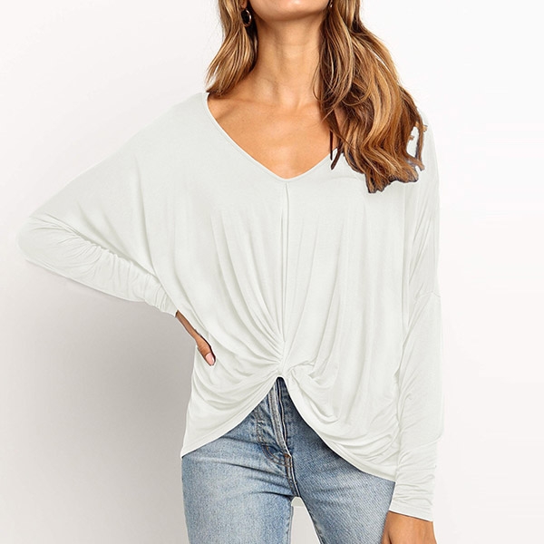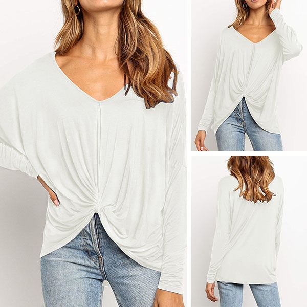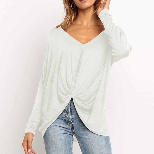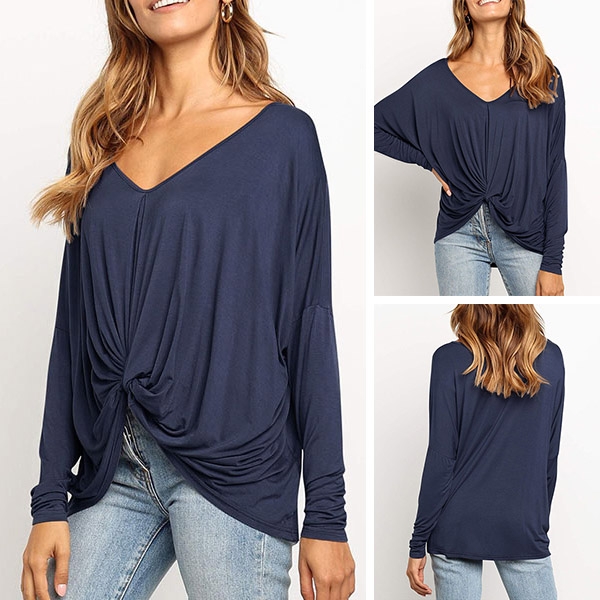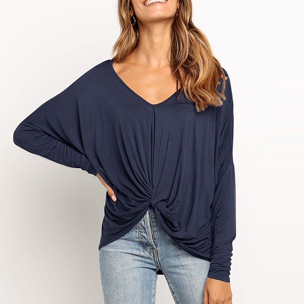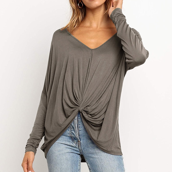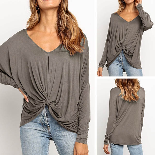 v-neck and twisted hem design,this piece can easily enhance your fashion level. Try to match with your tight pants to finish a fashionable daily look.