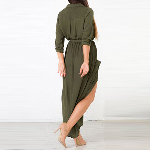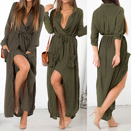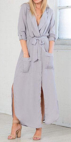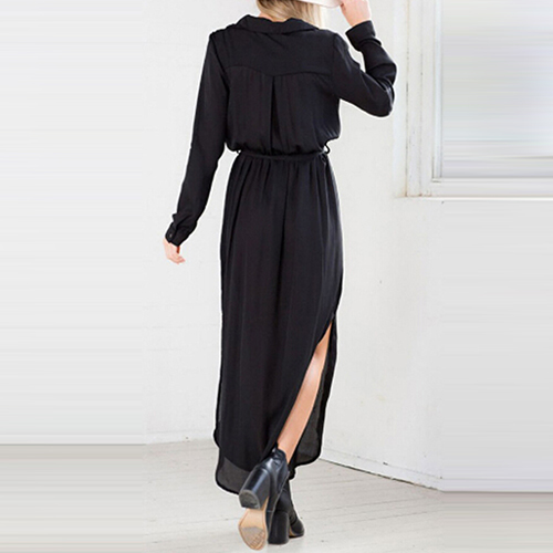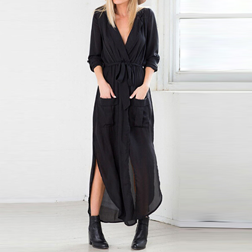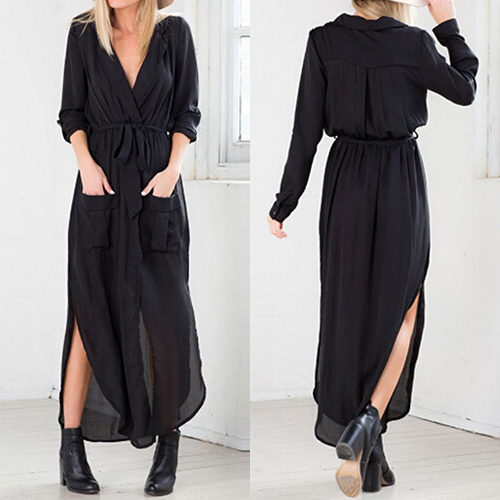 Featuring side slits, two front pockets, this dress is fine definition of elegance, sexiness and charisma.