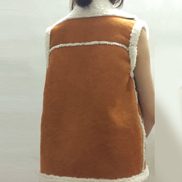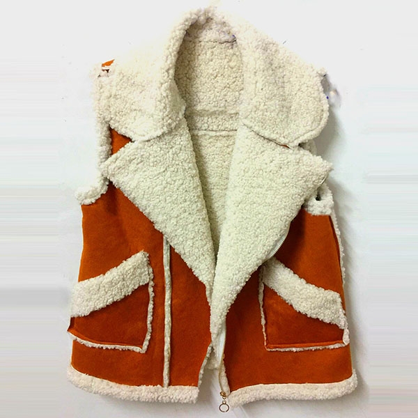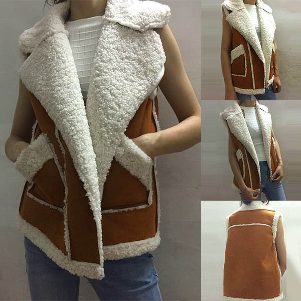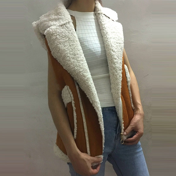 spliced faux fur plush lining and trim, outfit with zipper front design, notched lapel, sleeveless design and