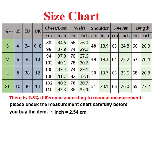 XL : Bust : 106cm - 114cm(41.73" - 44.88"); Waist : 78cm - 86cm(30.71" - 33.86"); Shoulder : 51cm(20.08"); Sleeve : 66cm(25.98"); Length : 69cm(27.17");