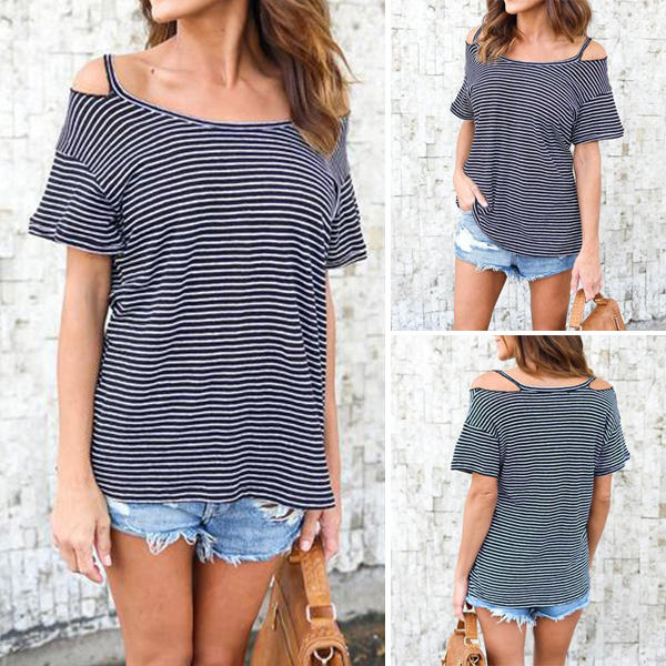 You can count on this short sleeve t-shirt to achieve for a cozy yet feminine style. Striped style,off-shoulder design adds