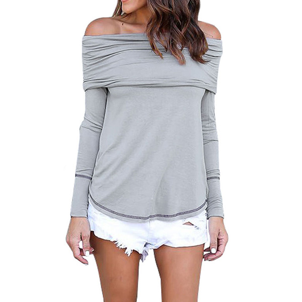 Fashion Off-shoulder Solid Color Long Sleeve Boat Neck Shirt