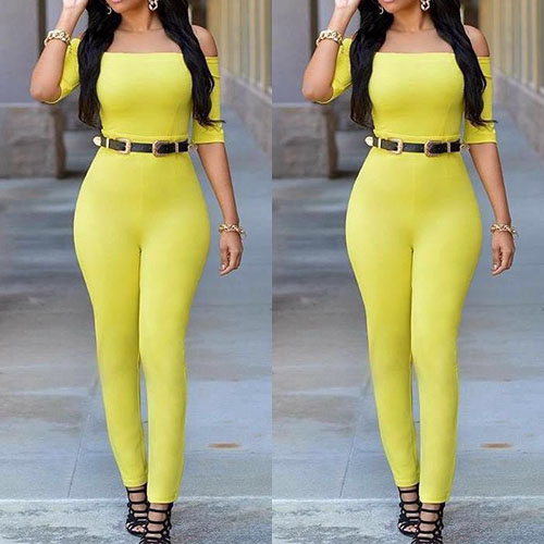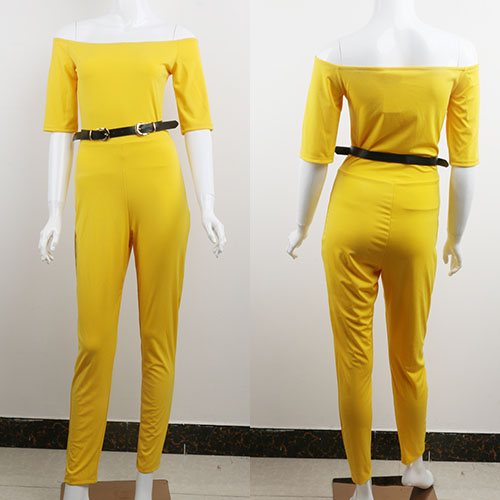 toned jumpsuit features off-the-shoulder, belted and 1/2 sleeves, these all presented in a clean