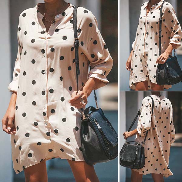 in this summer. This dress feature an allover polka dot print, a button front design, a basic collar, a relaxed