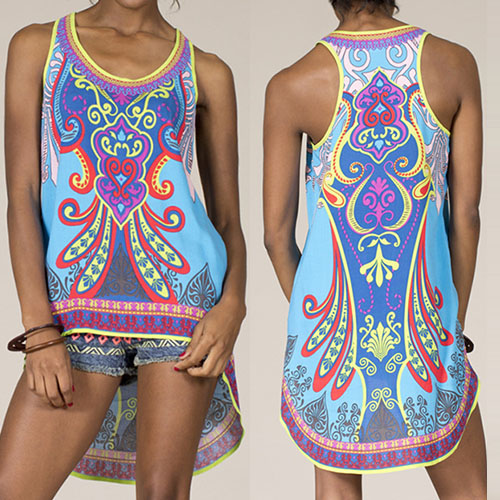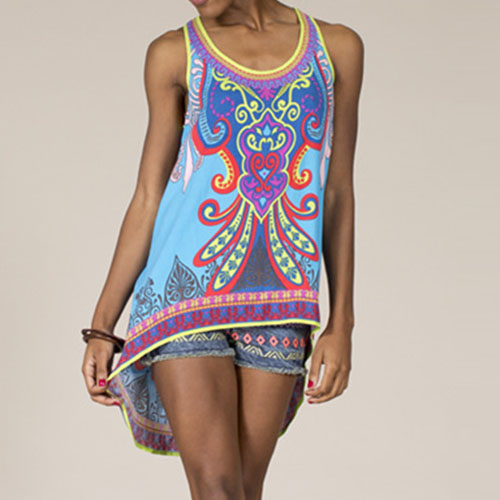 Features chic and eye-catching printed pattern,with a round neckline and a high-low