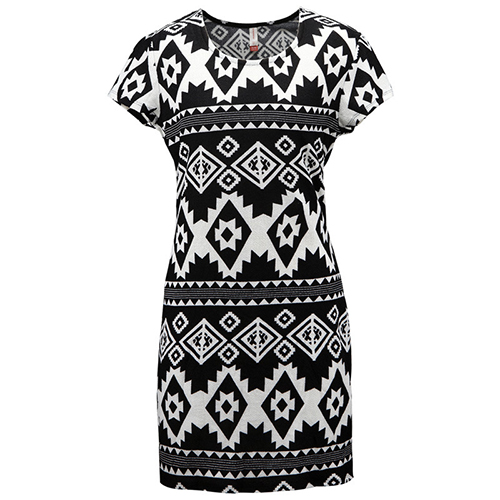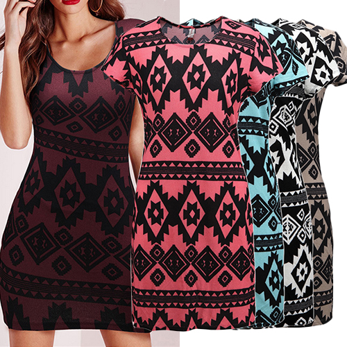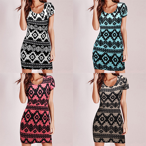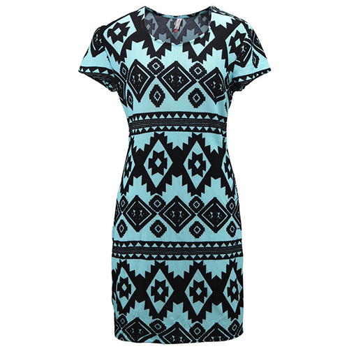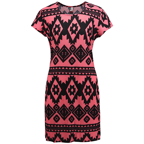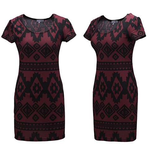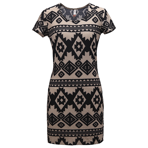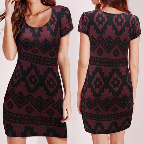This dress features chic and unique printed pattern,with short sleeve,round neck and a fit silhouette,