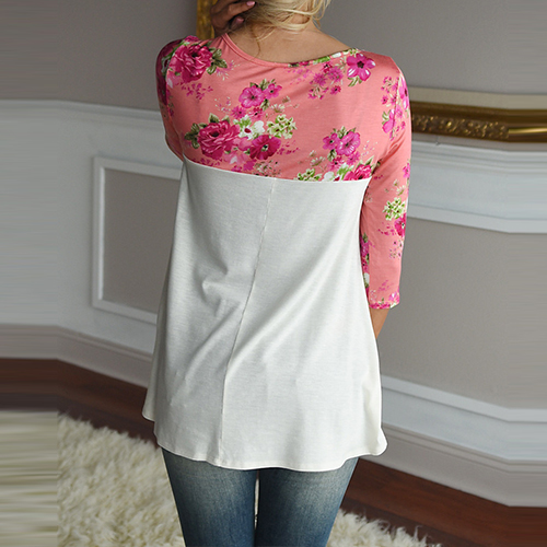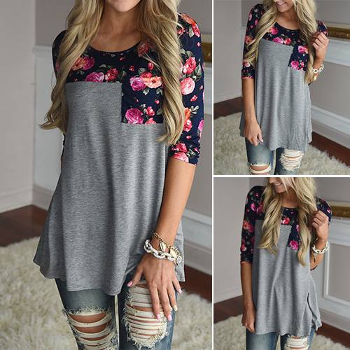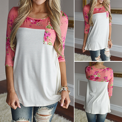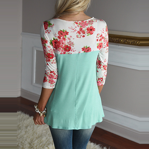 This t-shirt definitely will give you a cozy yet stylish style. Printed spliced style,with 3/4 sleeve,