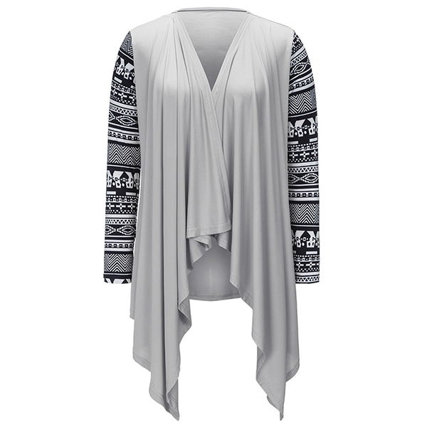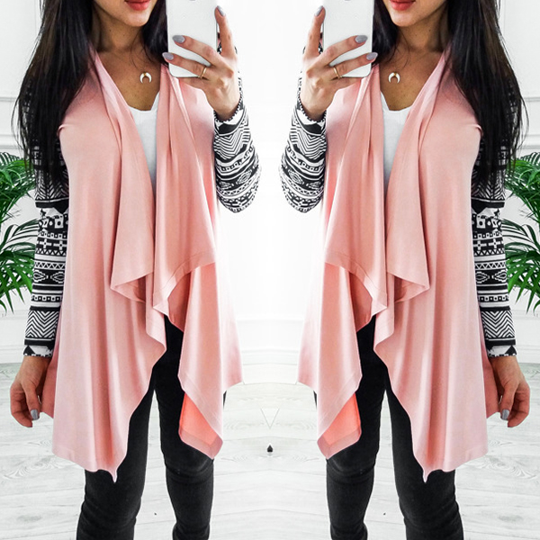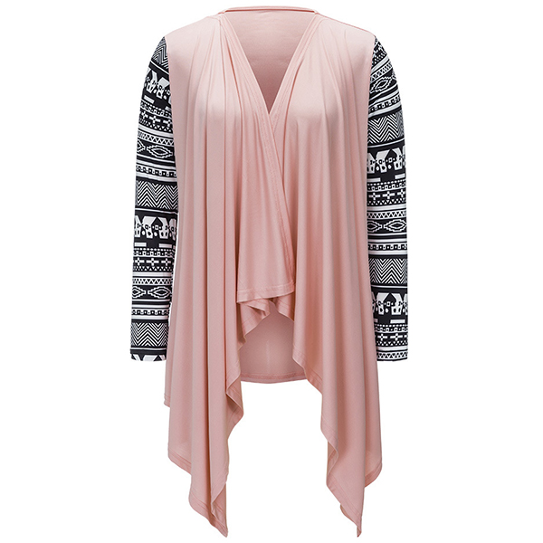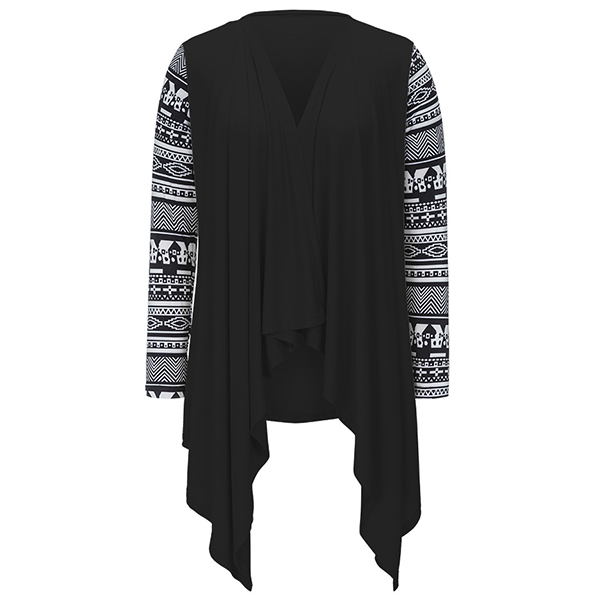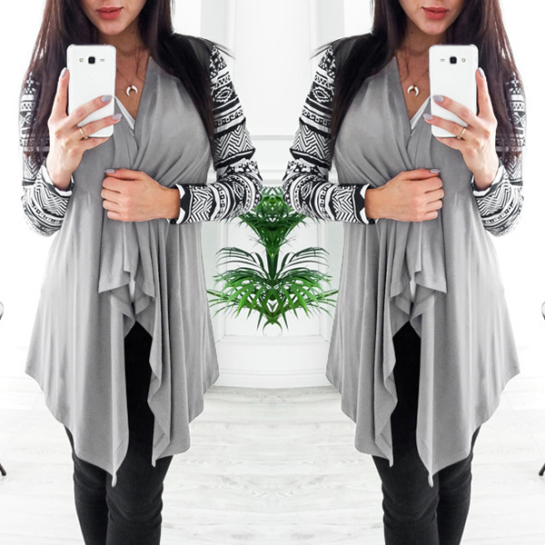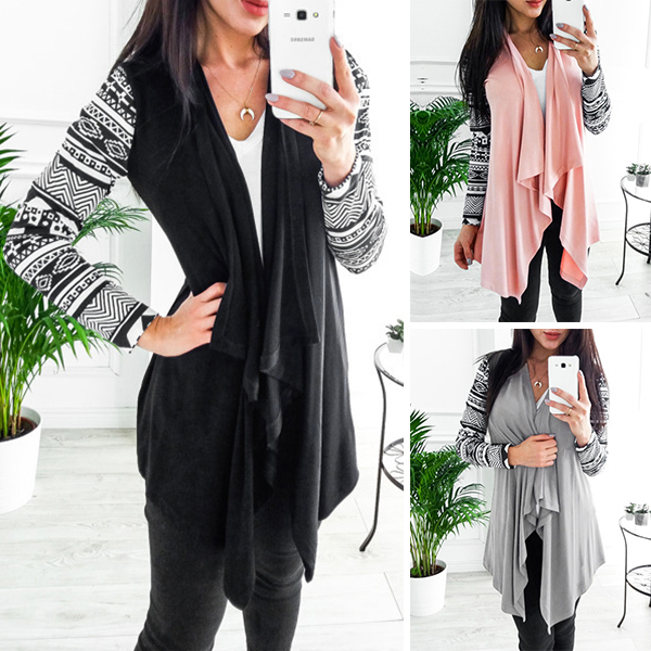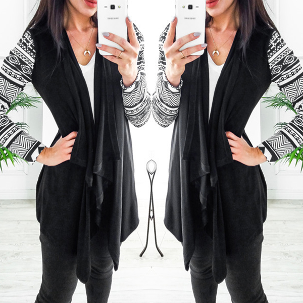 This cardigan is a good choice for these neither too hot nor too cold days. Printed spliced long sleeve and